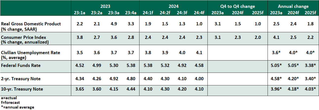 - Gross domestic product (GDP) grew at an annualized rate of 3.3% in the fourth quarter. Growth for the full year (on a Q4/Q4 basis) was 3.1% in 2023—overcoming a year of high interest rates, high inflation and high recession expectations. Annualized consumer spending growth of 2.8% once again led the overall increase. The momentum coming into the new year has prompted us to revise our projections upward. Outsized gains will not be the norm, but a forecast of below-potential growth is hard to justify.