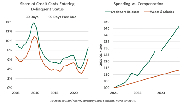The share of credit card balances entering severe delinquency (90 days past due) has risen from a record low of 3.0% in early 2022 to a 12-year high of 6.4% at the end of 2023.