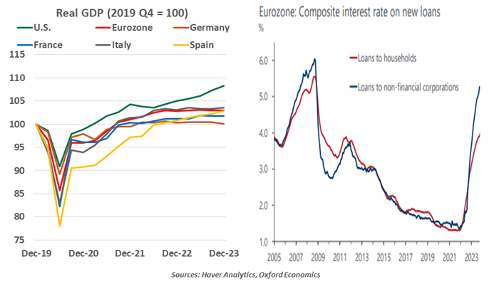 Tight monetary conditions in Europe have contributed to increasing economic divergence with the United States. Borrowing costs for non-financial corporations and households have surged in the past two years (see below chart). With banks representing a more important source of credit in Europe than in the U.S., high interest rates have curbed activity much more directly. By contrast, financial conditions in the U.S. have continued to ease over the past few months, despite elevated policy rates.