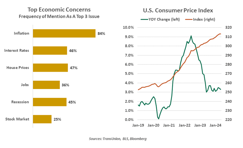 One reason for the disaffection is inflation, which is a leading concern for Americans. This surprises some economists, who point to significant improvement on this front over the past two years. The most recent reading of the Consumer Price Index showed a yearly increase of 3.3%, down from the peak of more than 9% in 2022. Most analysts expect continued moderation in the months ahead.