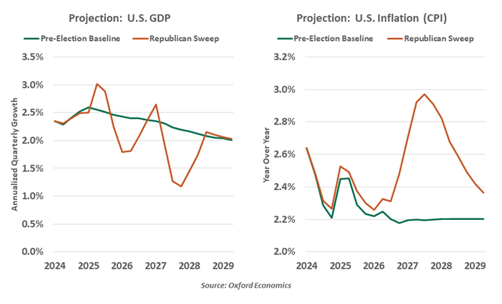 - Increases in tariffs and reductions in immigration are more likely and could be more extensive under unified government. However justified these measures might be, both will add to inflation.