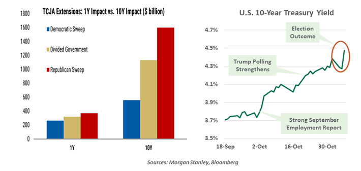 - As a result of all of the above, interest rates are likely to be higher for longer than they would have been under a divided government. Look for friction between the administration and the Federal Reserve to re-emerge.