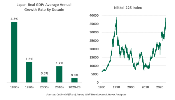 Good times never last forever, and this cycle peaked with an asset bubble that burst in late 1989. A stronger yen in the late 1980s made Japanese exports more expensive, just as other Asian nations emerged as competitors in key categories like steel, autos and consumer electronics. Japan once had 8 of the top 10 banks in the world, but credit problems (mostly related to inflated real estate) caused a crunch that hampered Japan’s economy for a long time. Deflation set in and stayed, hindering consumption.
