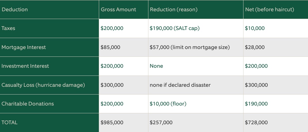 In this case, $1,231,300 of Brennan’s and Isabel’s income is taxed at the 37% rate and their net itemized deductions are $728,000: Therefore, the lower number of $728,000 is applicable. Of these deductions, $39,351 will be disallowed by the ceiling. This means that Brennan and Isabel will be able to deduct $688,649 of the $985,000 they spent on deductible items.