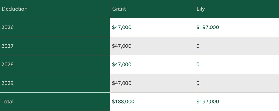 Grant and Lily each pledged to give $200,000 to their local hospital between 2026 and 2029. Each of them has annual income of $600,000, putting them in the 35% marginal rate backet. Grant plans to make four separate annual gifts of $50,000, and Lily plans to make a $200,000 gift in 2026 to satisfy her entire pledge. As the following table illustrates, Lily’s total deductions are $9,000 or 5% more than Grant’s over the four-year period.